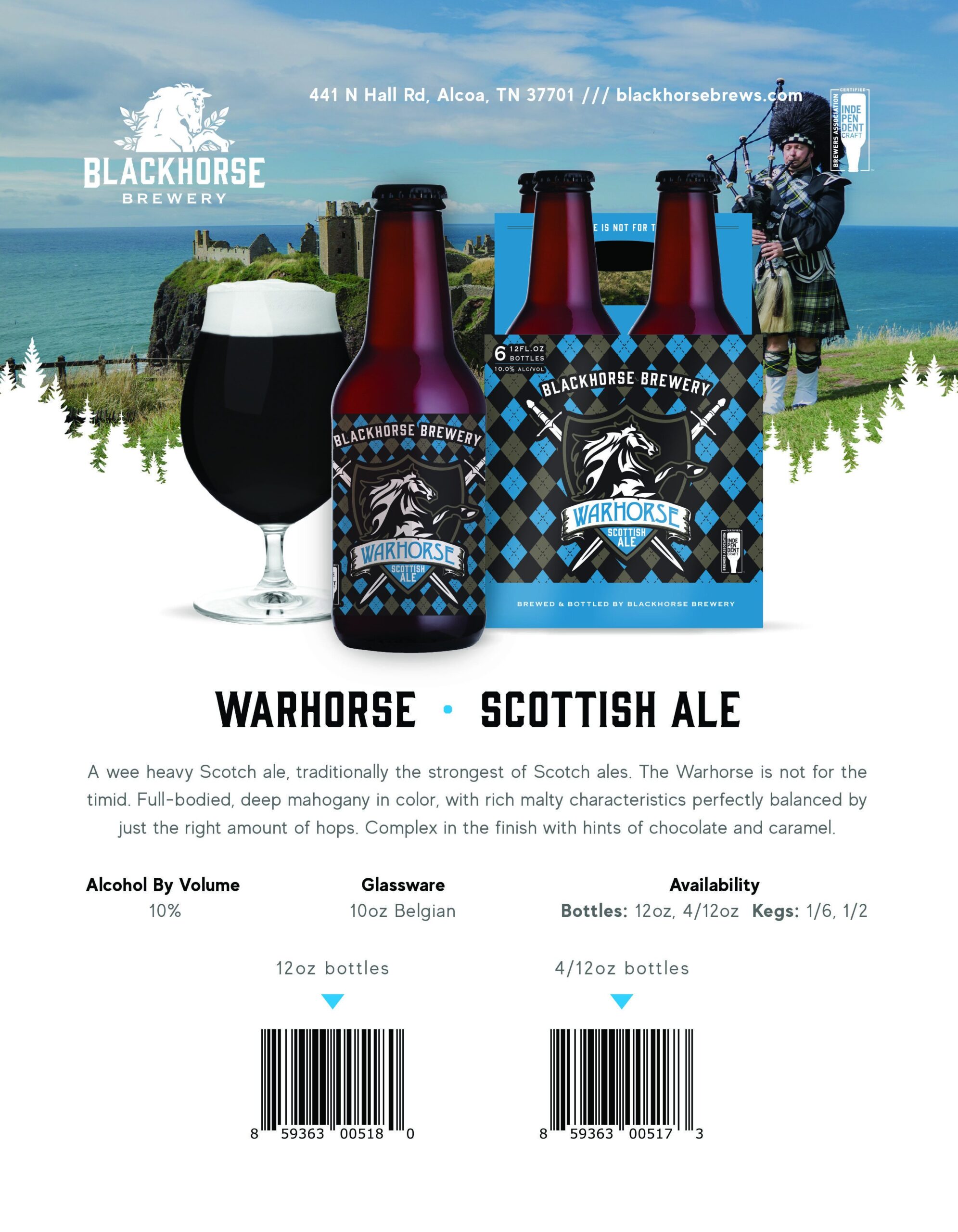 A bourbon barrel-aged wee heavy Scotch ale, traditionally the strongest of Scotch ales. The Warhorse is not for the timid. Full-bodied, deep mahogany in color, with rich malty characteristics perfectly balanced by just the right amount of hops. Complex in the finish with hints of chocolate & caramel.