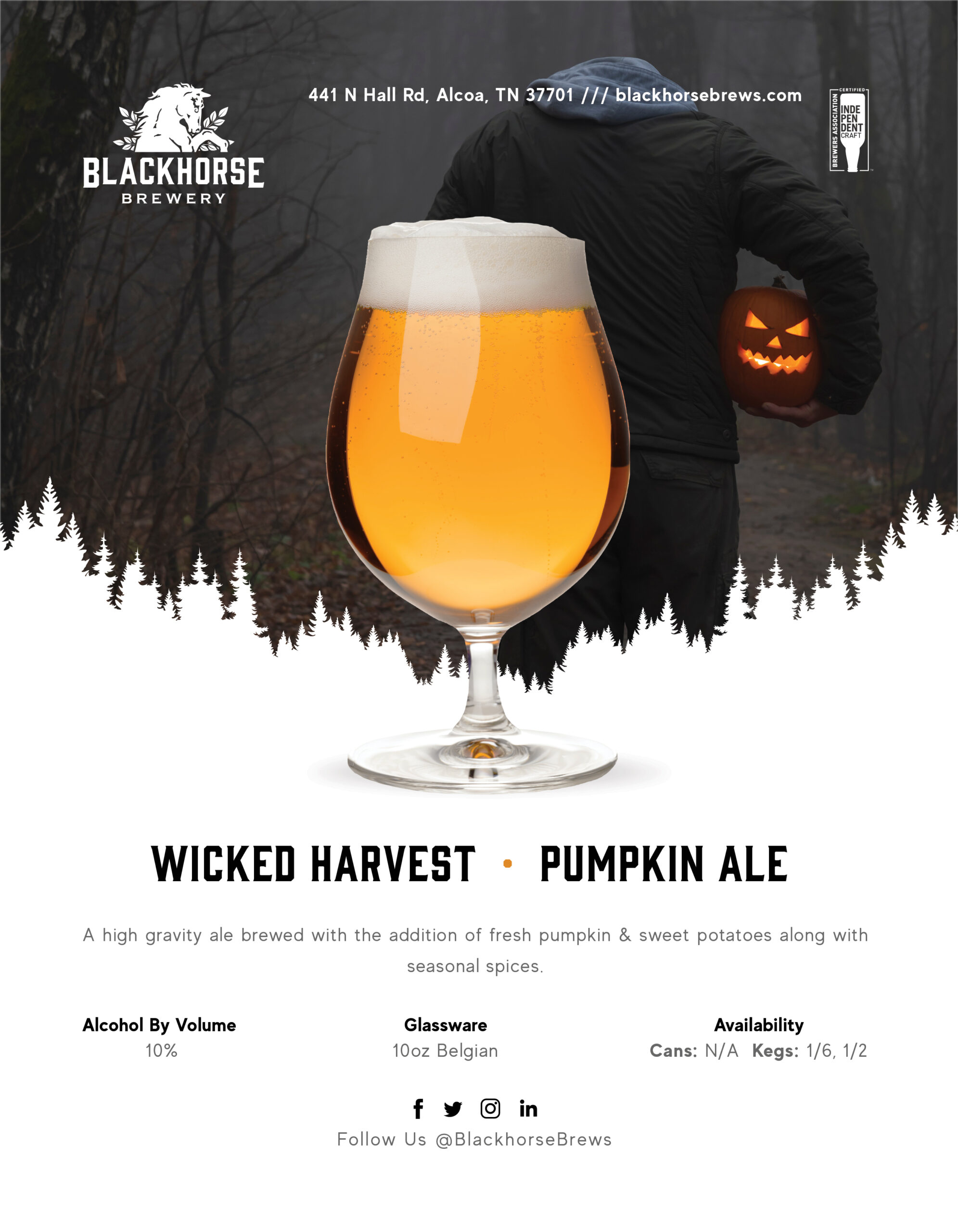 Handcrafted with locally sourced pumpkins & sweet potatoes, our Wicked Harvest is a slightly sweet & seasonal spice-flavored high gravity ale with an aroma of wheat, Vienna malt, brown sugar, & grandma’s pumpkin pie spice, complete with a dry, warm, boozy finish.