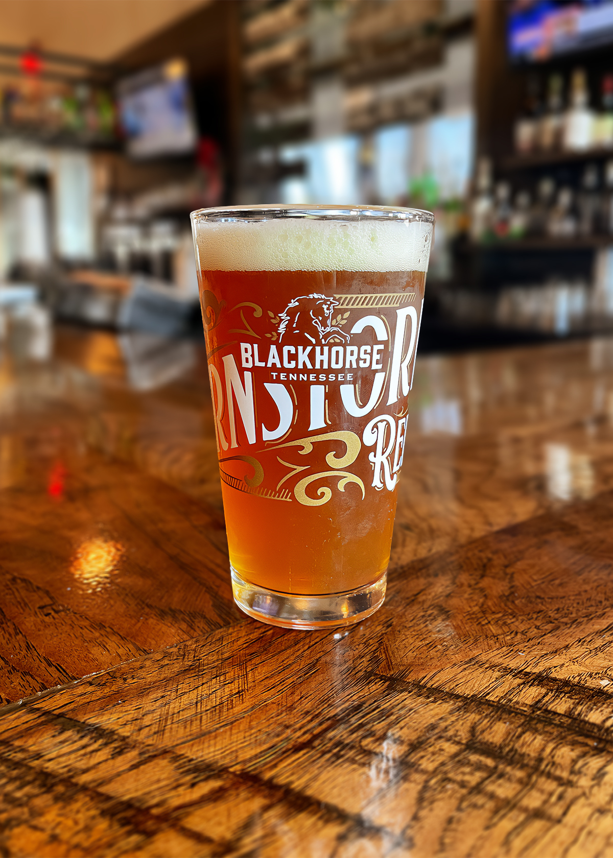 16oz pint glass with etched Barnstormer Red Ale and Blackhorse Tennessee logo.