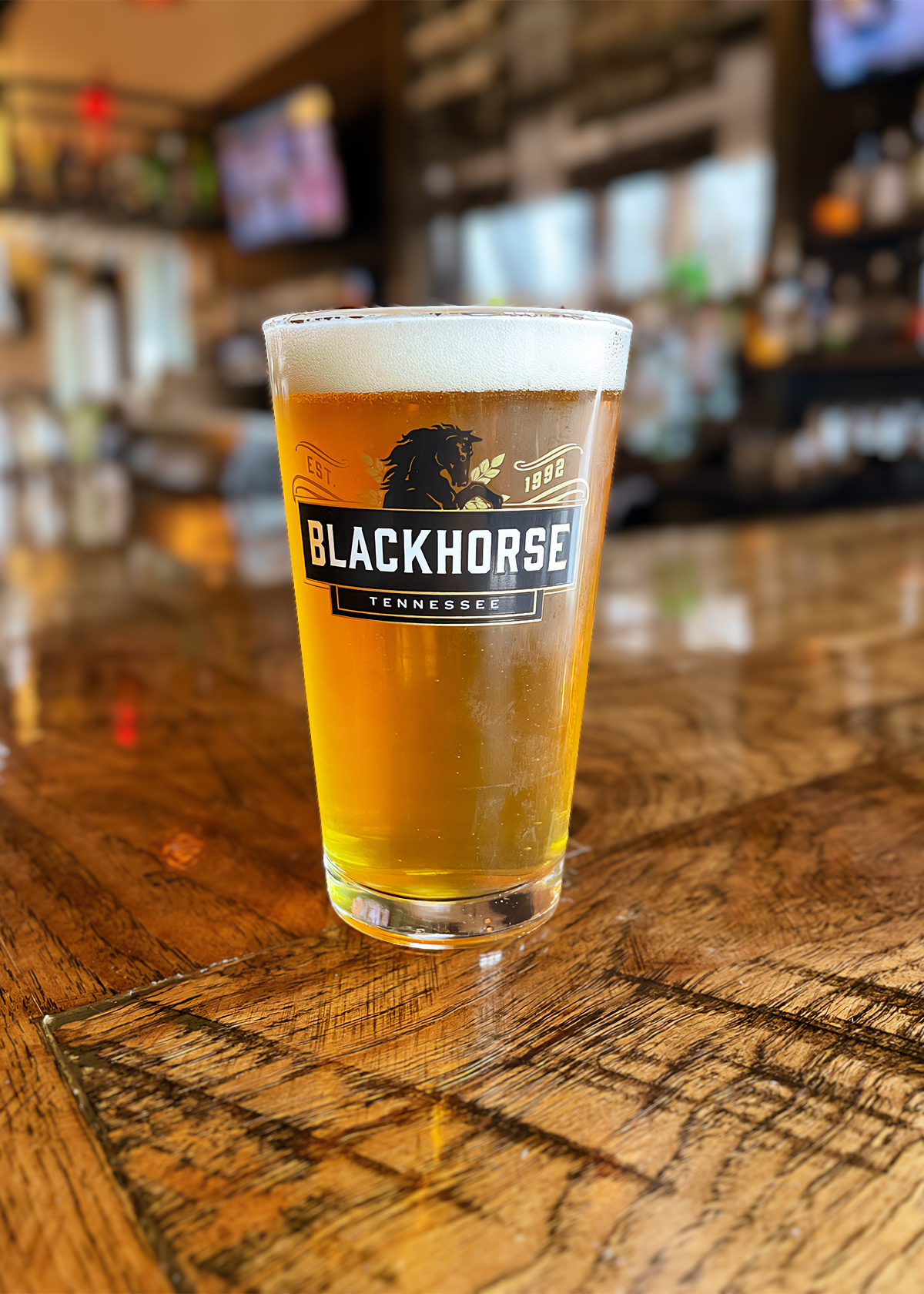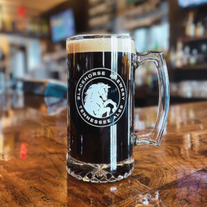 16oz pint glass with etched Blackhorse Tennessee logo.