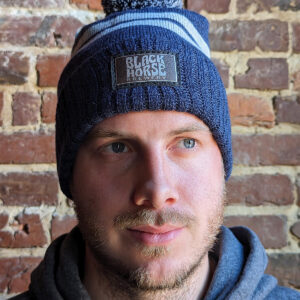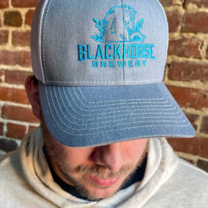 Trucker style hat with vegan leather Blackhorse patch on front with adjustable snapback.