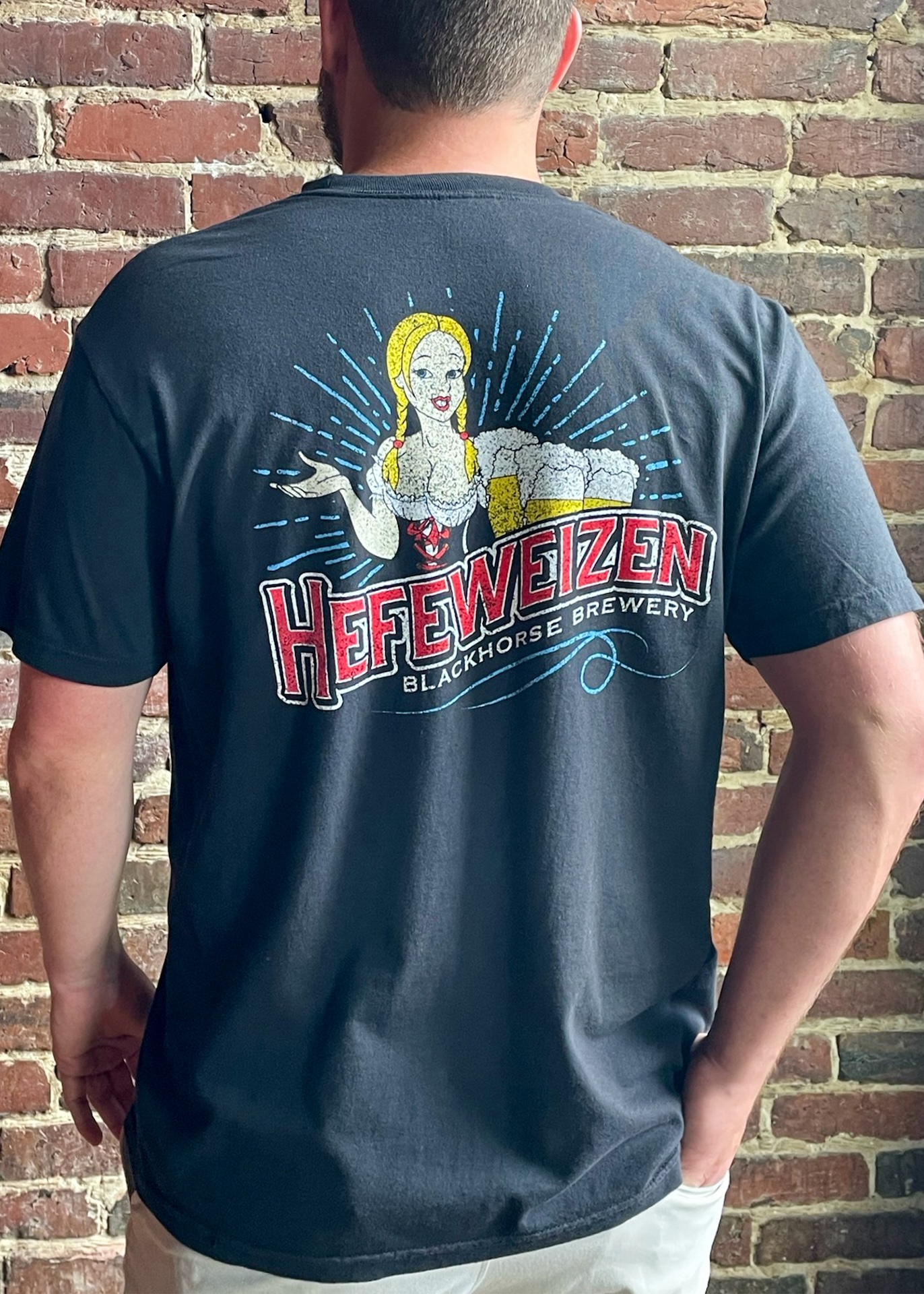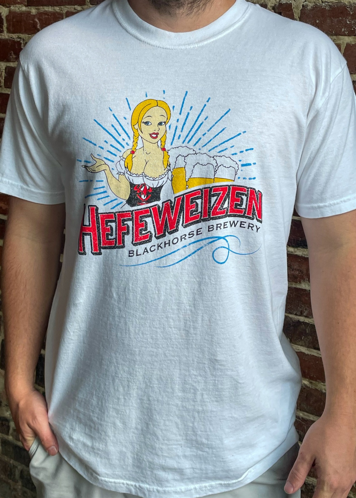 features our Hefeweizen beer on the front and our Blackhorse tagline on the