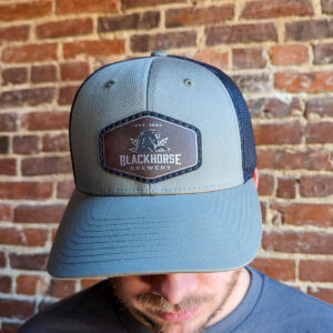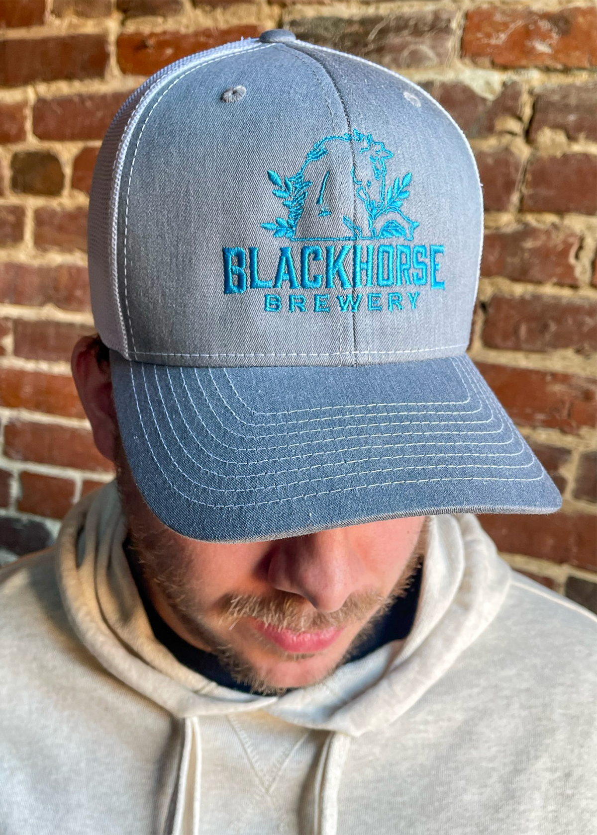 Trucker style hat with teal embroidered Blackhorse logo on front with adjustable snapback.