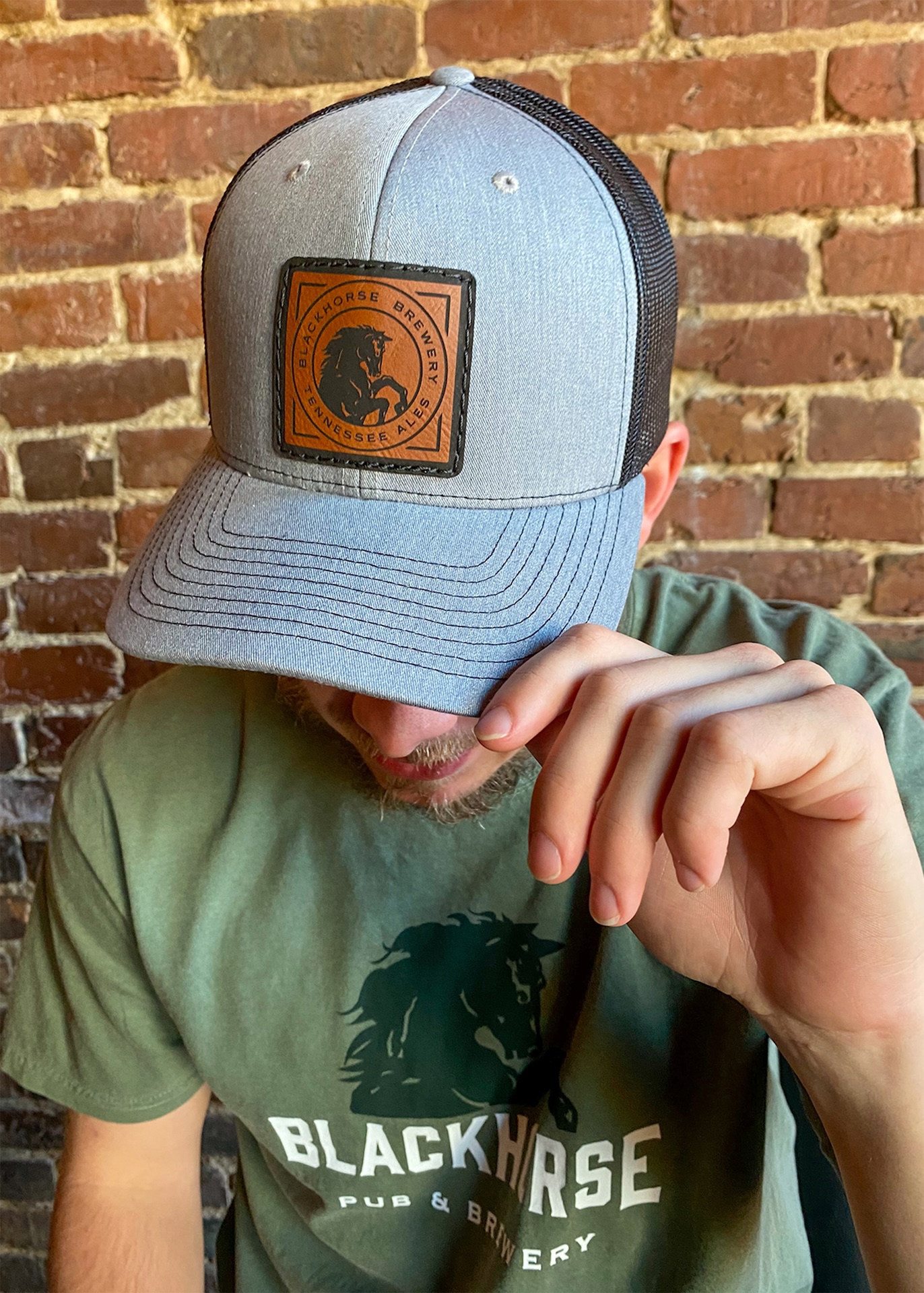 Trucker-style hat with vegan leather Blackhorse patch on front and adjustable snapback.